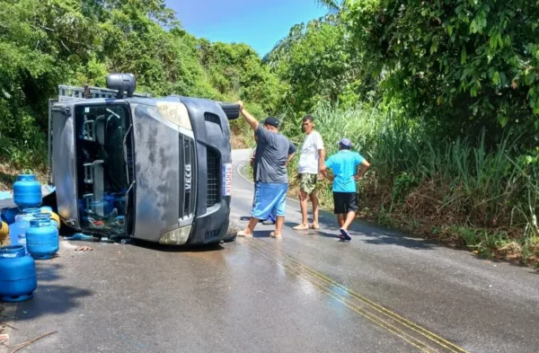 Perigo na pista: Caminhão carregado com gás e água tomba na BA-084